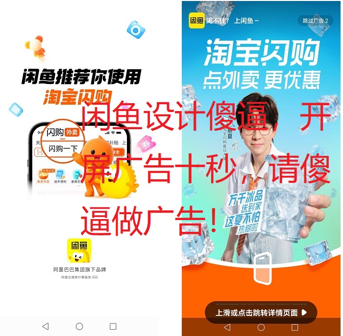 闲鱼策划真是傻逼 开屏广告5秒加5秒 主要的后5秒还用的小鲜肉做的广告。这个垃圾傻逼我也不认识 你要知道闲鱼的最终用户是谁,再找代言人啊? 用傻逼做广告,真的不知好歹!
